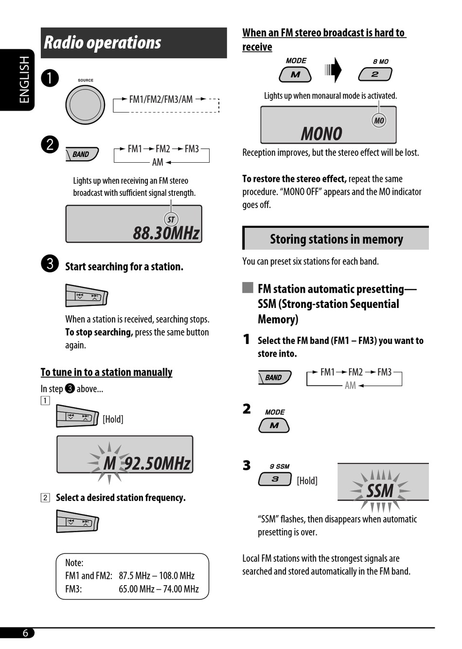 FM1 and FM2: 87.5 MHz – 108.0 MHz