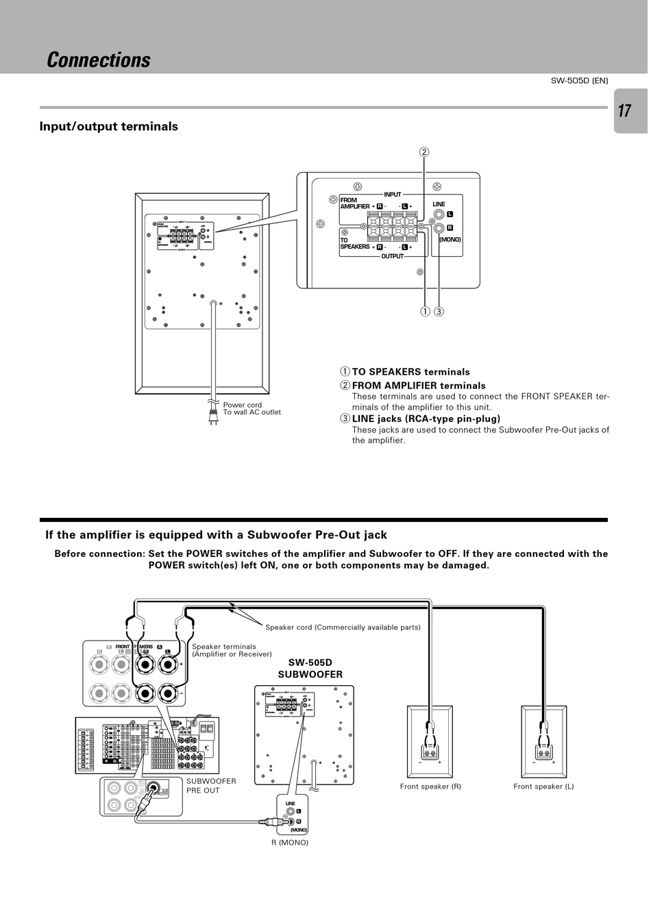 Before connection: Set the POWER switches of the amplifier and Subwoofer to OFF. If they are connected with the
