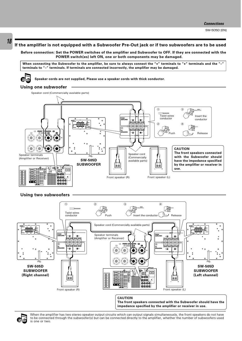 If the amplifier is not equipped with a Subwoofer Pre-Out jack or if two subwoofers are to be used