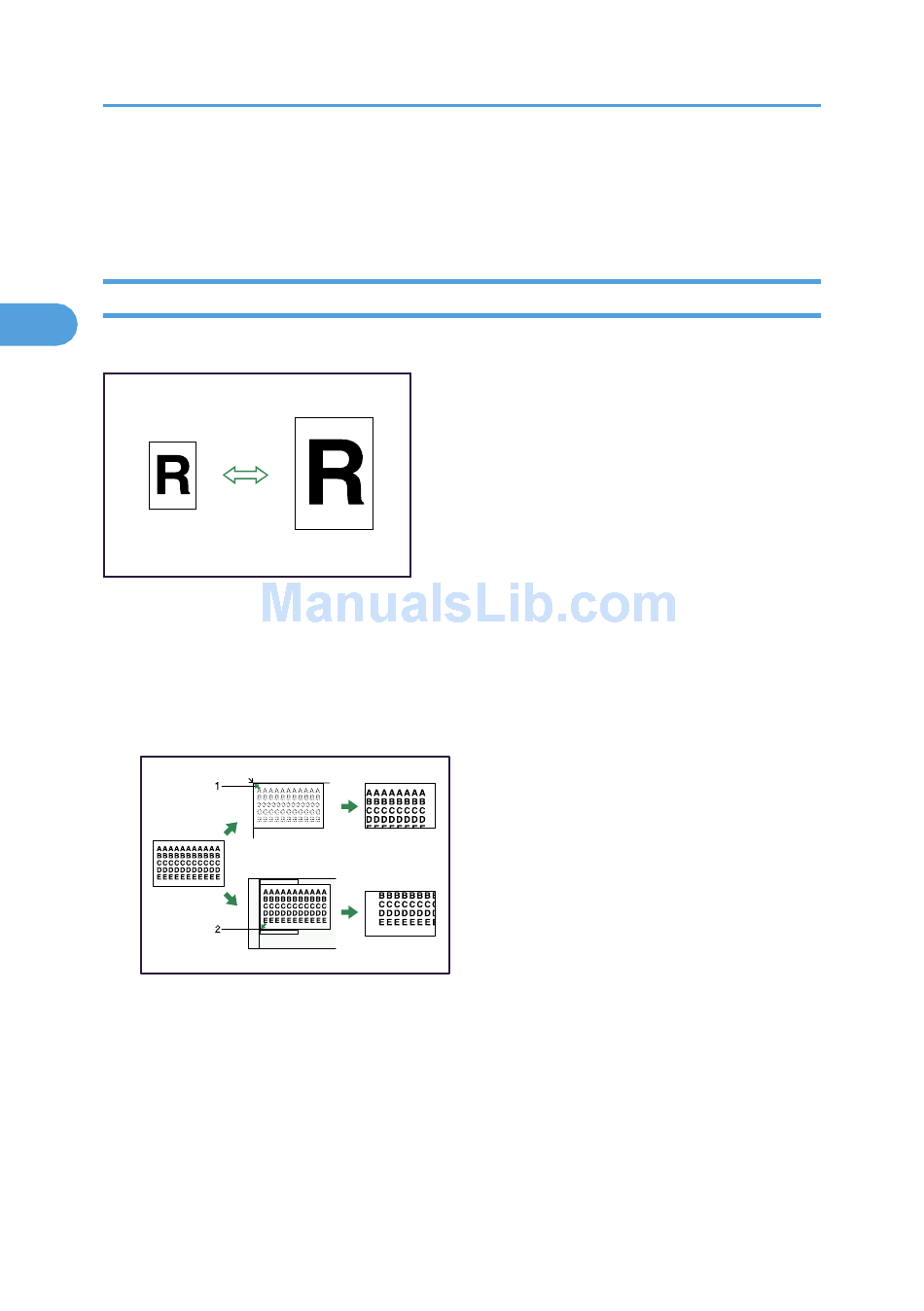This section describes methods of reducing or enlarging images by specifying a reproduction ratio.