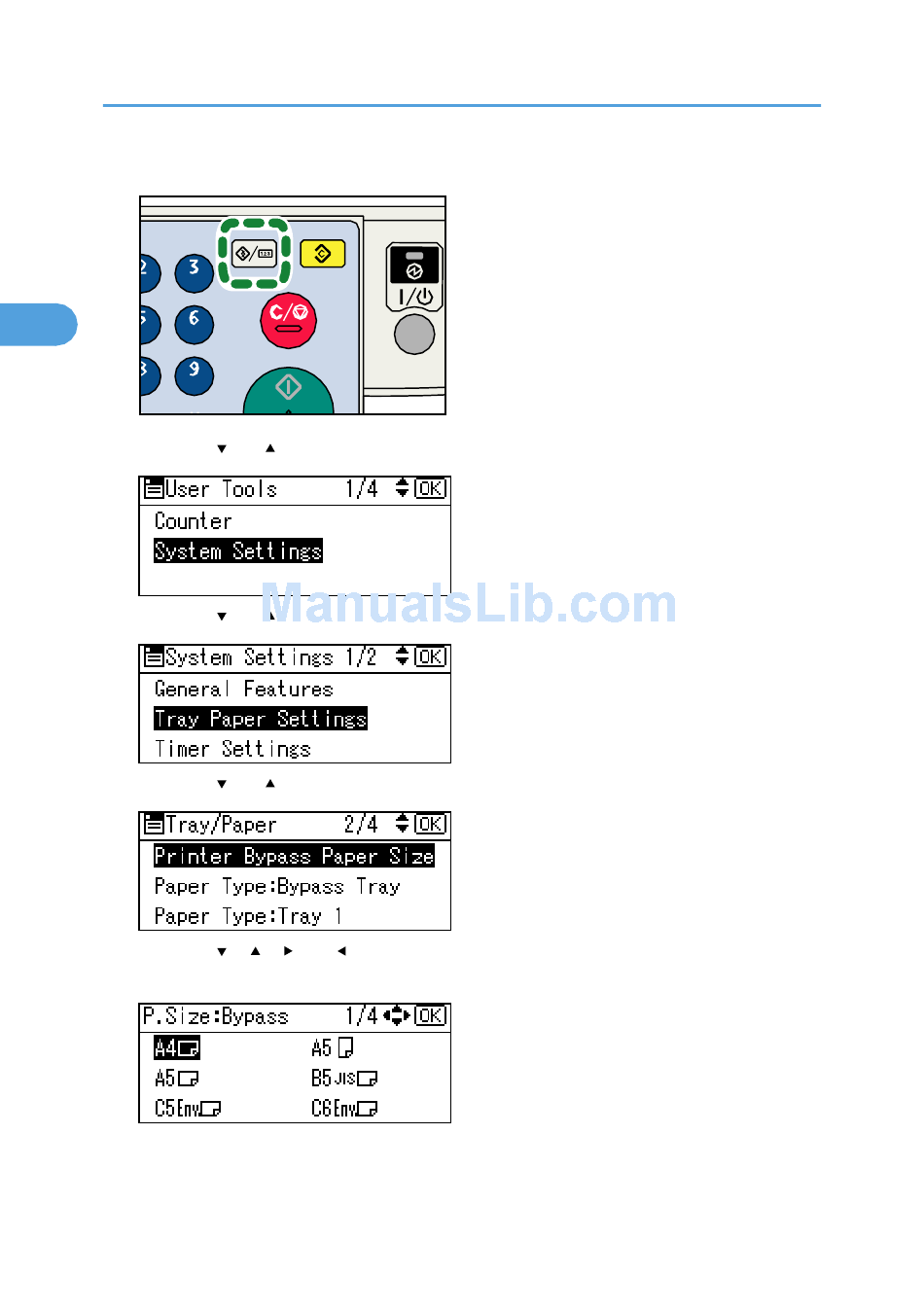 Press the [ ] or [ ] key to select [Printer Bypass Paper Size], and then press the [OK] key.