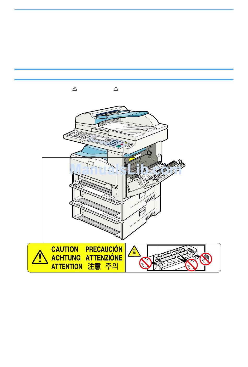 High temperature. Be careful of hot parts when clearing paper jams.