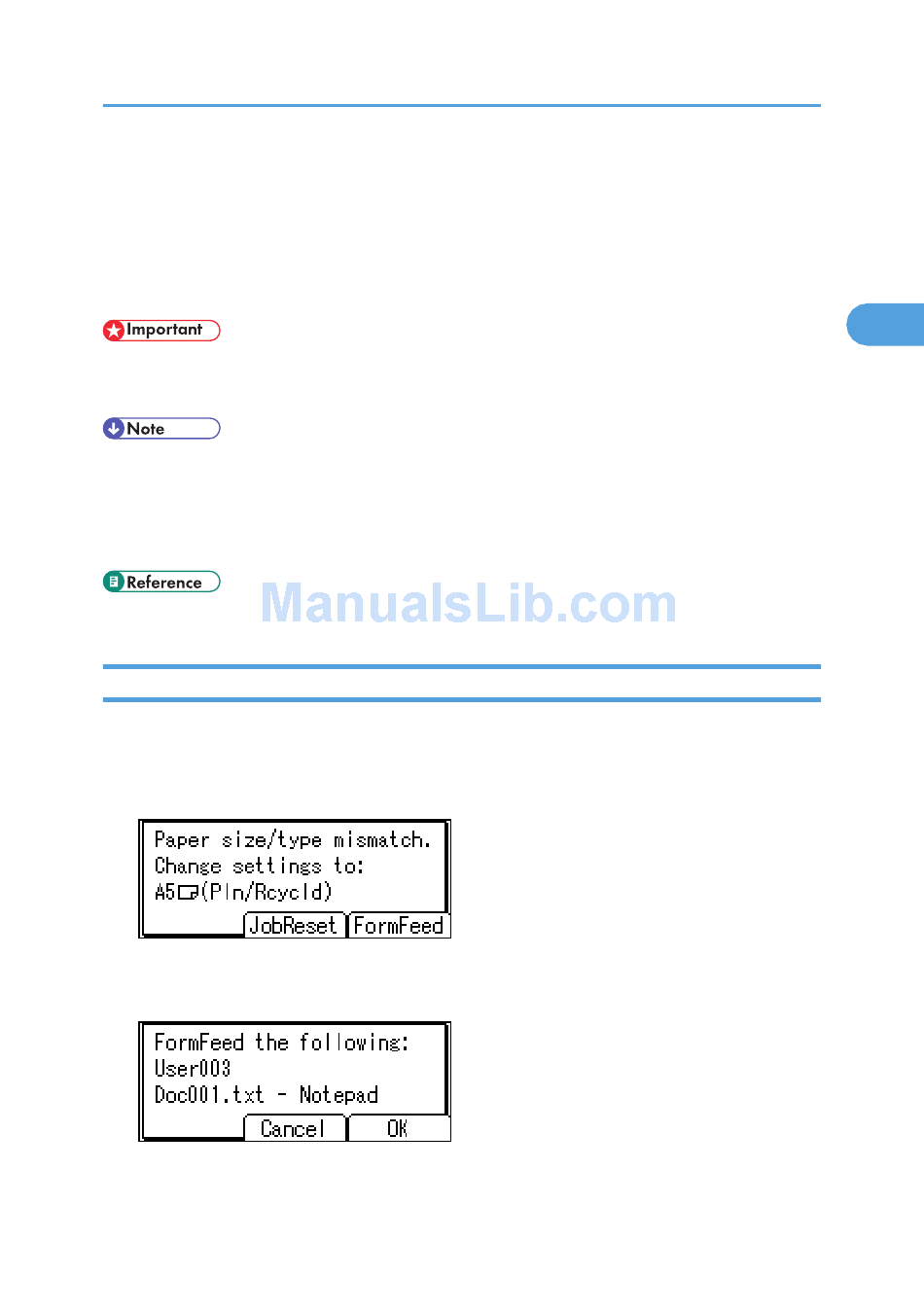 • If form feed is selected for a tray with the following settings, you can change the tray by canceling