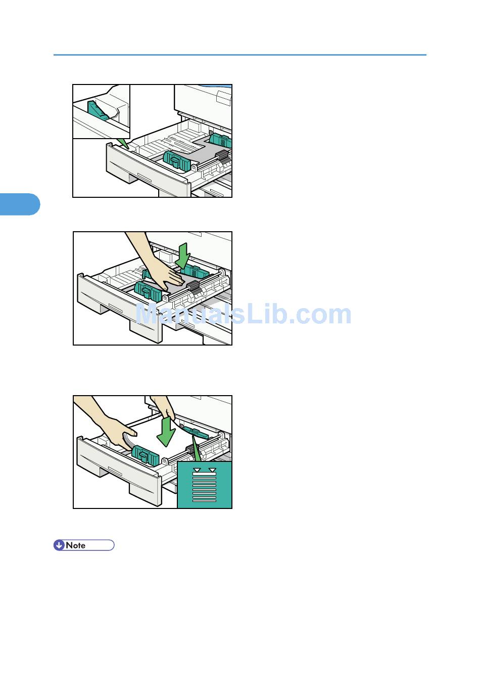 • When setting small quantities of paper, be careful not to squeeze in the side fence too much. Paper