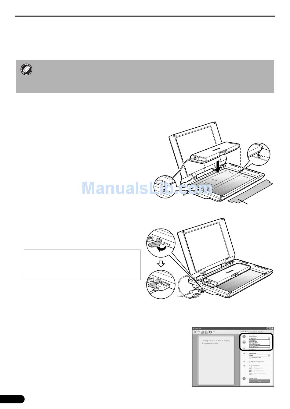 This scanner can scan 35 mm film strips (6 frames at a time). Follow the procedure below when scanning
