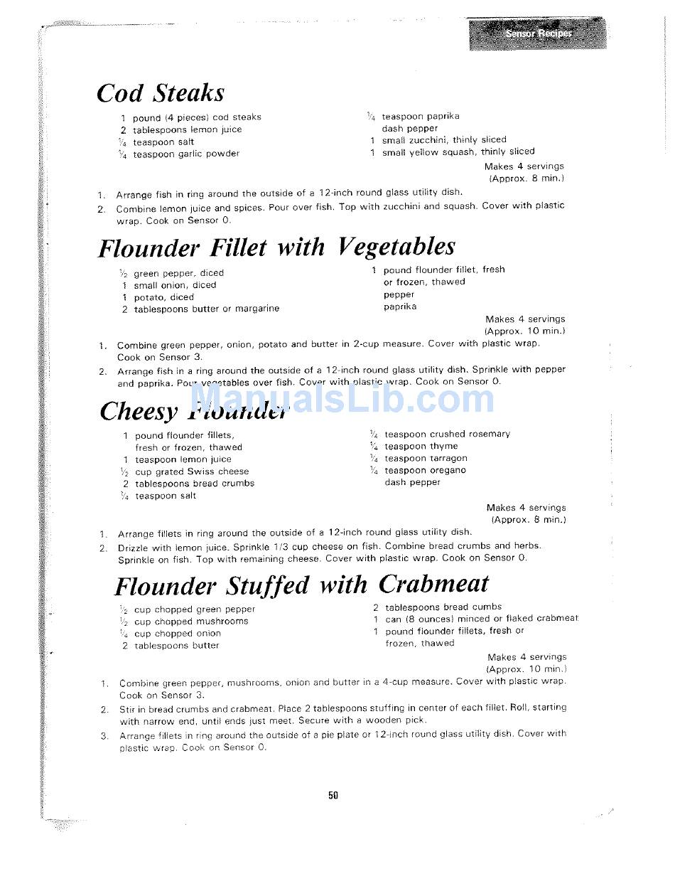 Cod Steaks; Flounder Fillet With Vegetables; Cheesy Flounder; Flounder Stuffed With Crabmeat - Sharp Carousel Ii R-8570 Operation Manual