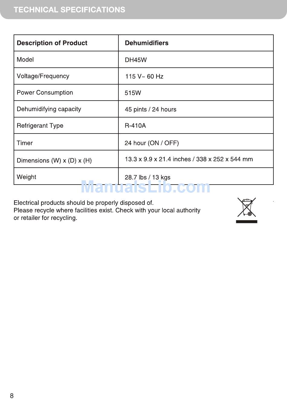 Honeywell DH45W Owner's Manual page 9